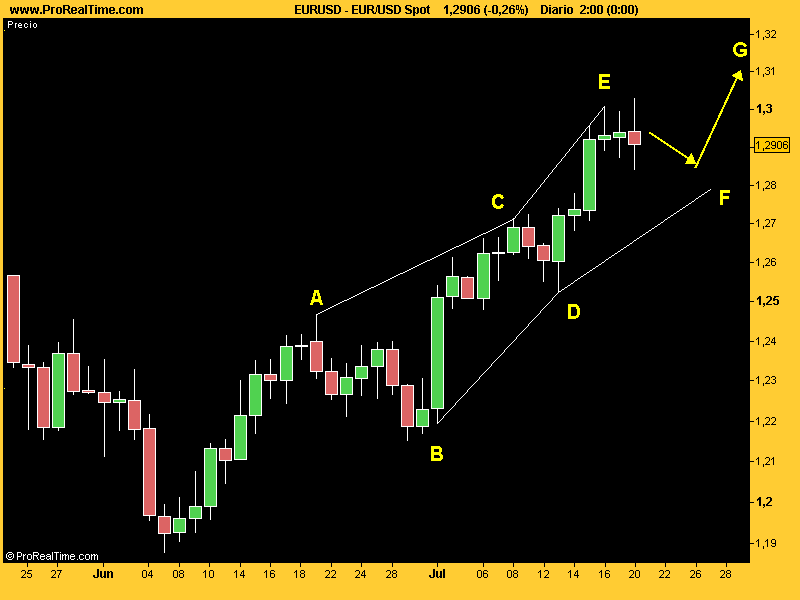 Pues la onda alcista sigue su curso, pero a G solo le faltan unos pipos para ser=A en precio, que en tiempo ya es mayor...con que podríamos estar cerca de un giro. Evidentemente, pa volverse bajista hace falta alguna pista...que ahora no hay. En un gráfico de 4 horas se ve que esta onda alcista va por un canal perfectamente definido. Estos canales no suelen terminar en el extremo: o no llega a la parte alta, o la traspasa.