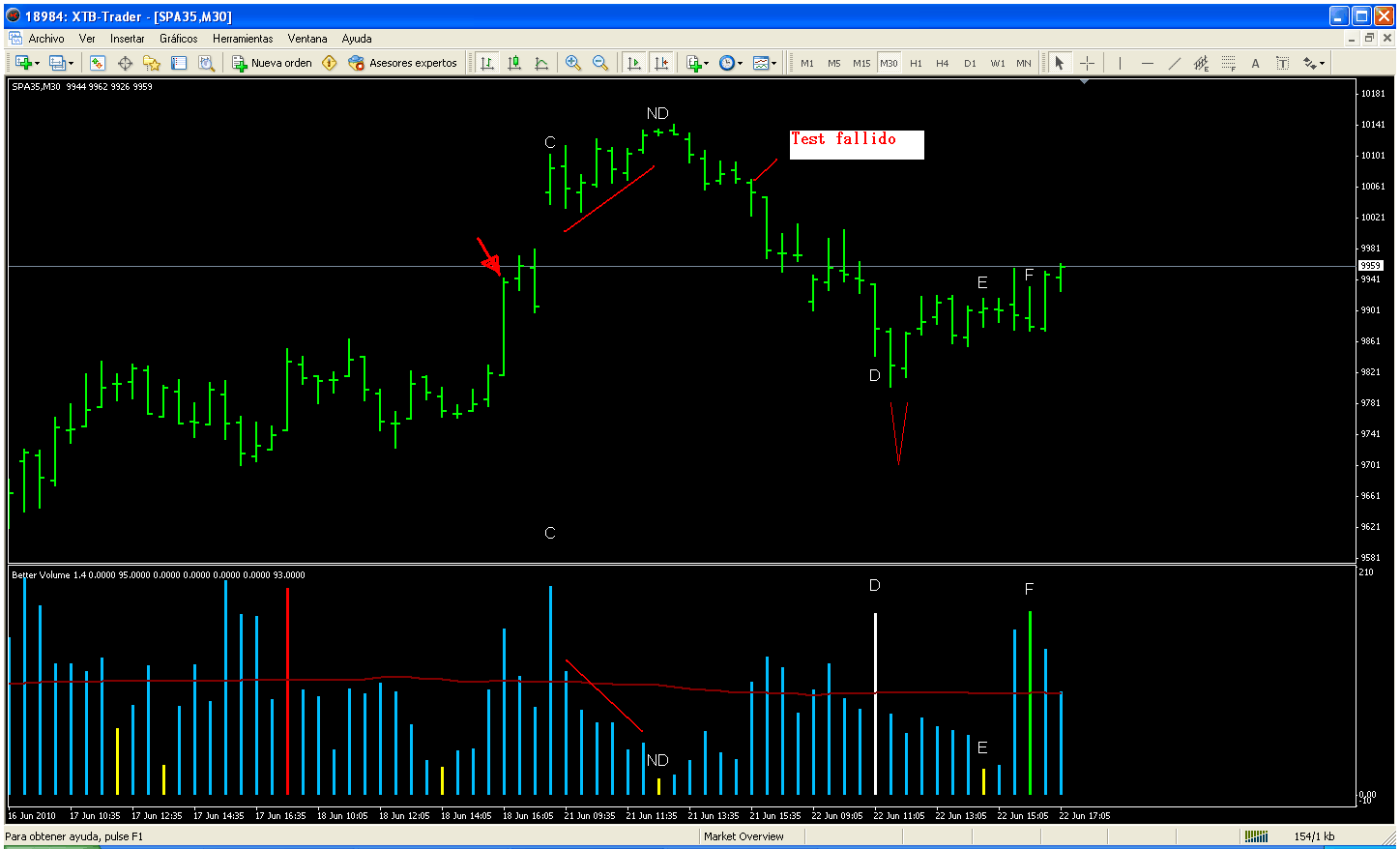 Test fallido. Esa es mi entrada. Esa barra es un TEST alcista con voluemen alto. ¿Cómo responde? Pues ya lo véis, barra almplia y cerrando en sus mínimos. Ahí entro en corto. Personalmente siempre siempre, entro en las barras de después de las señales, para ver si las señales se confirman o fracasan. En este caso, y después de los signos de debilidad que ya arrastro, un TEST alcista que falla de esa manera, es la entrada buena.