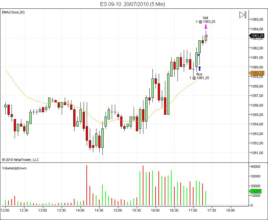 Luego veo un doji con un poco menos de volúmen (17:00) y a continuación la vela que me da la señal, alcista, marca nuevo máximo y cubre las anteriores velas. A la siguiente, es la mia. Entro con objetivo 2 puntos: entrada en 1061,25 aprovechando un retroceso de la vela, y salgo en 1063,25. Seguramente precipitado, pues la vela fue otra vez larga y con más volúmen todavía lo que me indica que acontinuación podrían venir nuevas entrada. PEro mi objetivo; 2 puntos diarios, ha sido logrado.