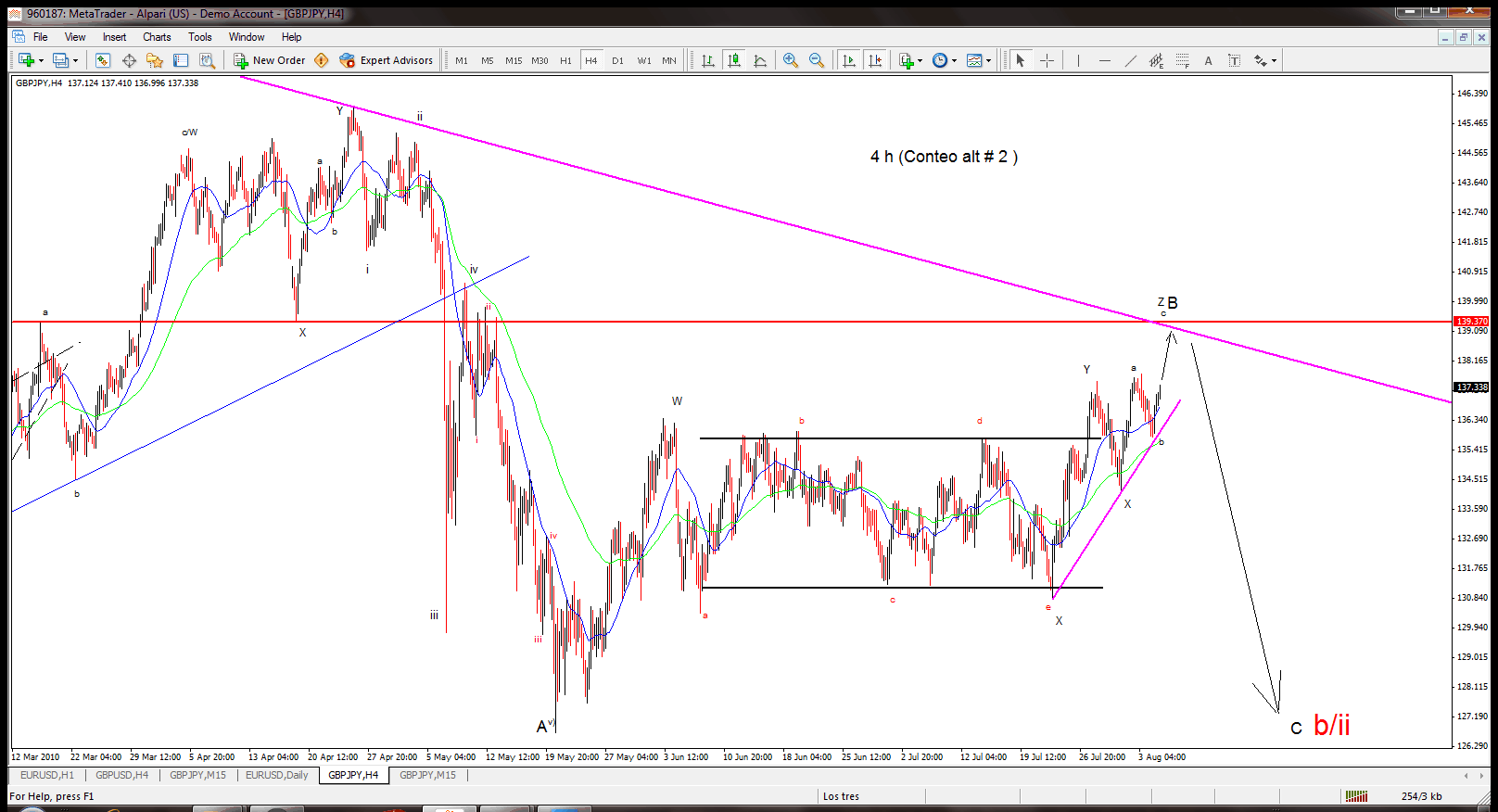 El par GBP/JPY siguio el rumbo q traiamos en el conteo secundario (alternativo) , todo indica q el mismo se encuentra ahora en medio de su ultima onda alcista (c de (Z) la cual deberia terminar en la zona del 139.20 aproximadamente , ya en dicha zona el par deberia comenzar su caida en busca de nuevos minimos .