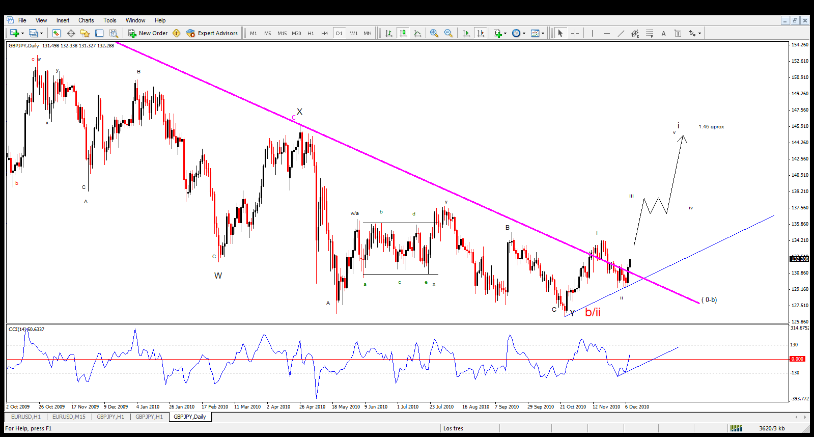 Todo parece indicar q la onda (b/ii) iniciada en el mes de agosto de 2009 ha culminado despues de haber roto la linea (0-b), de estar en el conteo adecuado el par GBP/JPY ha realizado su primera sub-onda al alza de un total de 5 q seria esta ultima la onda 1ra de (C) y estaria ubicada aproximadamente en la zona del 1.45.Suerte