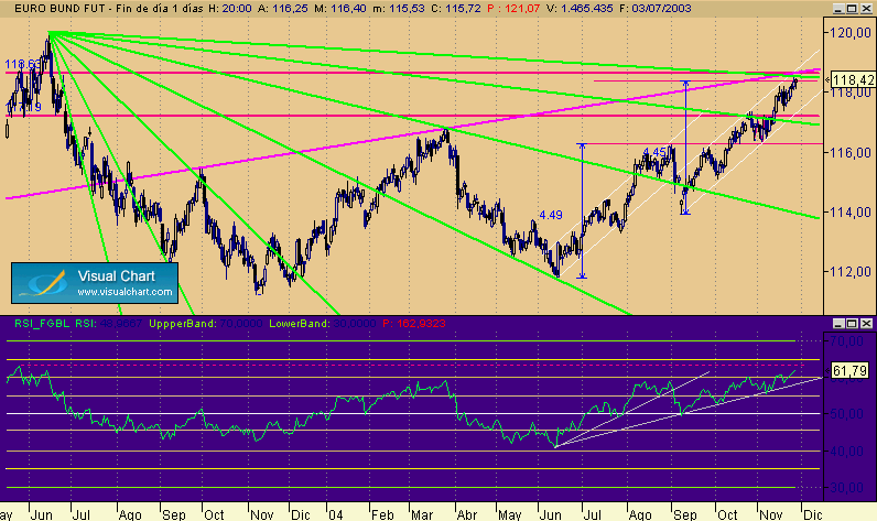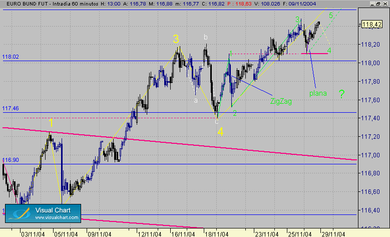 Recordais apx hace un mes: el primer grafico de rayasssssssssssss, este es el siguiente. LLeva dos impulsos casi identicos en precio y en tiempo, la correcion esta cerca, igual q el vencimiento. Elliott se presta a infinidad de interpretaciones y recuentos y hasta q no terminan el desarollo totamente pocas veces se ve nada claro, incluso entonces esta dudoso. El grafico del dia 24-11 una TRIPLE 3 era valido hasta termino, ahora la interpretacion mirando desde otra perspectiva, se ve otro escenario,cual sera el que de en la diana y cual erroneo , no lo sabremos hasta q no termine. Dicho esto operar en base a elliott solamente creo q es un error grave , si lo llevas como referencia para ver las tendencias es otra historia.