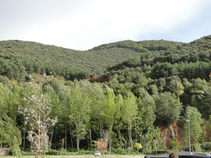 Vista de la Sierra de Cantabria, con el León dormido al frente, la zona alavesa a la izquierda y la navarra a la derecha. Las viñas de La Rioja Alavesa, otras de Logroño, Los chopos de la Ribera del río Ebro y los sauces llorones del parque del Ebro. Y todo esto frente al restaurante donde comíamos.