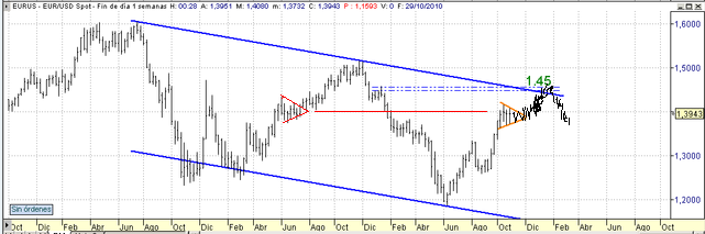 Por otra parte el euro-dólar parece estar formando un triángulo de continuación alcista con objetivo teórico en niveles de 1.45