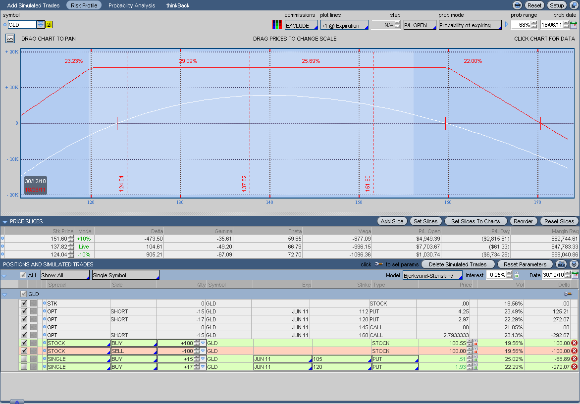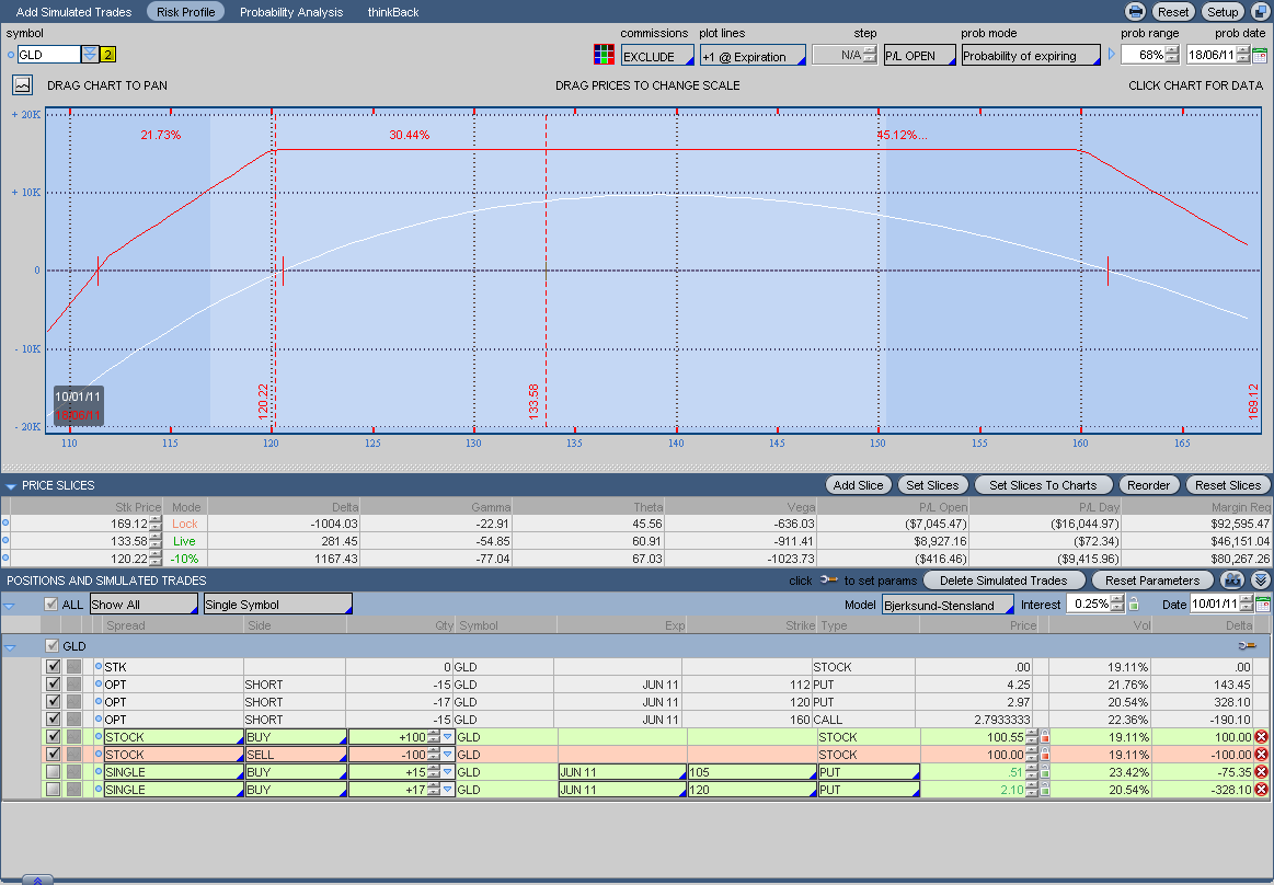 Hoy vamos a hacer un pequeño ajuste, ya que el oro parece estar haciendo máximos temporalmente, como el mercado esta cerrado y no voy a poder estar luego, he vendido 300 stocks del GLD por 134,2, así dejo la Delta un poco negativa (-30), mi intención es re-comprar estas 300 acciones sobre 128-130, pero ya veremos...