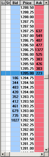 Por ejemplo, el precio actual está en 1285.00, si estamos comprados y tenemos un stop de venta en 1284.00 vemos que hay 420 contratos en espera de comprar en ese precio. En el momento que el precio toque 1284.00 todos los stops que estén en ese nivel llenarán los 420 contratos de compra (suponiendo que no cambia la cantidad, obviamente), pero si hay más de 420 contratos tratando de vender, entonces el resto pasará al siguiente nivel (1283.75), y si aún así se cubren los 352 de ese nivel todavía hay más stops se pasa a 1283.50, y así sucesivamente hasta que no haya más órdenes de venta.