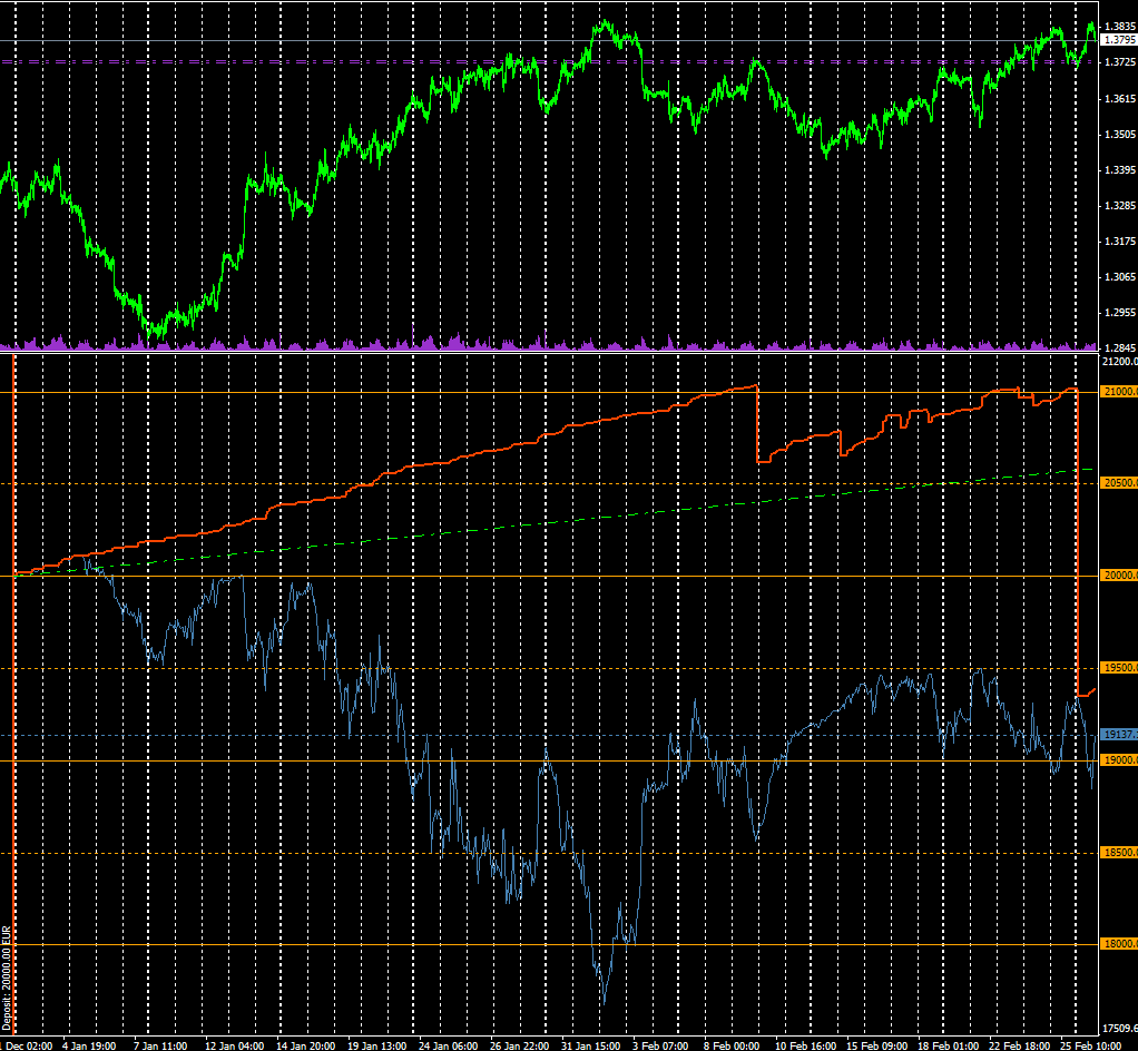 Día revuelto en el eurusd. Lo bueno de este sistema es que no es sensible a las trampas de ida y vuelta como las ocurridas hoy, siempre que éstas se encuentren dentro del rango de operaciones abiertas, ya puede ir y venir 100 veces que no tenemos peligro alguno. Si la mecha se produce fuera del rango, depende de como lleguemos al extremo del mismo, pero en las condiciones actuales, tampoco debería plantear ningún problema.