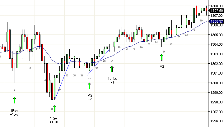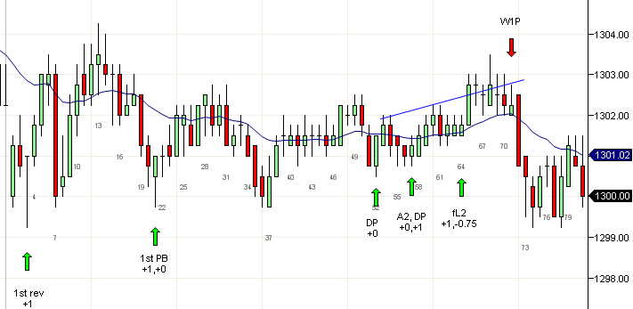 Aunque si la A2 falla, por ejemplo, rebasa el mínimo de la vela de señal o de entrada, se convierte entonces en una señal de corto en A2. Hoy el movimiento desde el mínimo de la vela 42 al máximo de la vela 55 fue un desplazamiento en dos segmentos que se convirtió en una clara señal de entrada en corto de A2 en el momento en que rebasó el máximo de la vela 45. Hasta que el preció cayó debajo de la vela 50, el largo en A2 no ha fallado. Una vez que falló en la vela 57, fallando el doble fondo, es un claro corto. La retracción de rompimiento de la vela 59 fue la mejor entrada para los cortos. La vela 77 fue otra posible A2 y una segunda entrada en corto (misma entrada que la vela 74, con fuerte señal en la vela 74 y la vela 75 de entrada). Ya que esto se dio cerca del final de la sesión, la mayoría de los operadores preferirían salir de sus cortos en lugar de volver a entrar en nuevas posiciones.