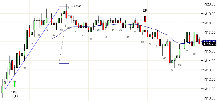 Hoy se presentaron muy pocas entradas de poco riesgo, y la primera entrada fue la primera retracción (1PB) en la vela 6. Podrías haberla mantenido hasta el fin de la sesión, pero frecuentemente el mercado te dice que no vale la pena aguantar hasta el final del día. Hoy se presentaron algunas de estas señales que no deben ser ignoradas.
