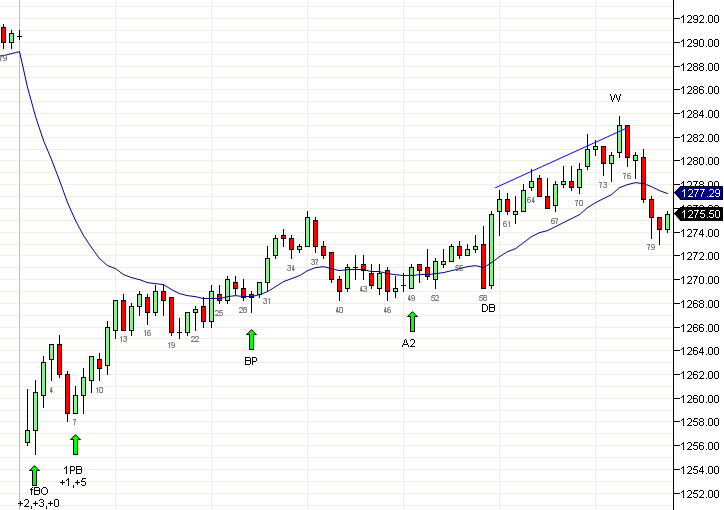 Una vez que tuvimos una pobre entrada en largo con A2 en la vela 40 que nadie tomó, la tendencia básicamente se terminó, y lo mejor que podemos hacer es esperar un rompimiento. Un rompimiento tardía de una DP en la vela 78 puede haber iniciado un rompimiento para una tendencia bajista que puede continuar en la siguiente sesión.