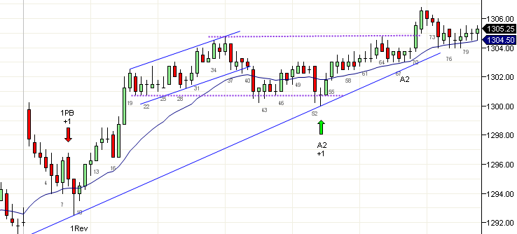 En un día de rango, cualquier movimiento de dos segmentos al otro extremo del rango puede operarse como si fuera una A2 (velas 31 y 46) aunque no sean estrictamente continuación de una tendencia. Una vez que la tendencia ha terminado en una dirección, el siguiente rompimiento puede ser en cualquier dirección, por lo que es buena idea entrar en cada movimiento de dos segmentos si se forma de una forma aceptable.