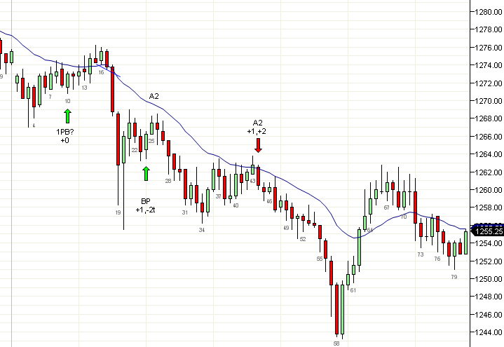 Una vez que tuvimos una pobre entrada en largo con A2 en la vela 40 que nadie tomó, la tendencia básicamente se terminó, y lo mejor que podemos hacer es esperar un rompimiento. Un rompimiento tardía de una DP en la vela 78 puede haber iniciado un rompimiento para una tendencia bajista que puede continuar en la siguiente sesión.