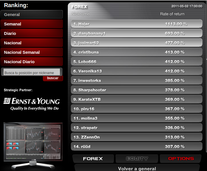 Yo empezé tarde....la cuenta de opciones se la pidió la parienta....que dice que se le dan bien.....no se que coño hizo..."ella tampoco" :lol: , que la ha dejado con 1K :shock: ...tendré que ponerme a ver que ha pasado, pero ya no tiene mucho arreglo para ir a por el tema del mercedes en opciones.