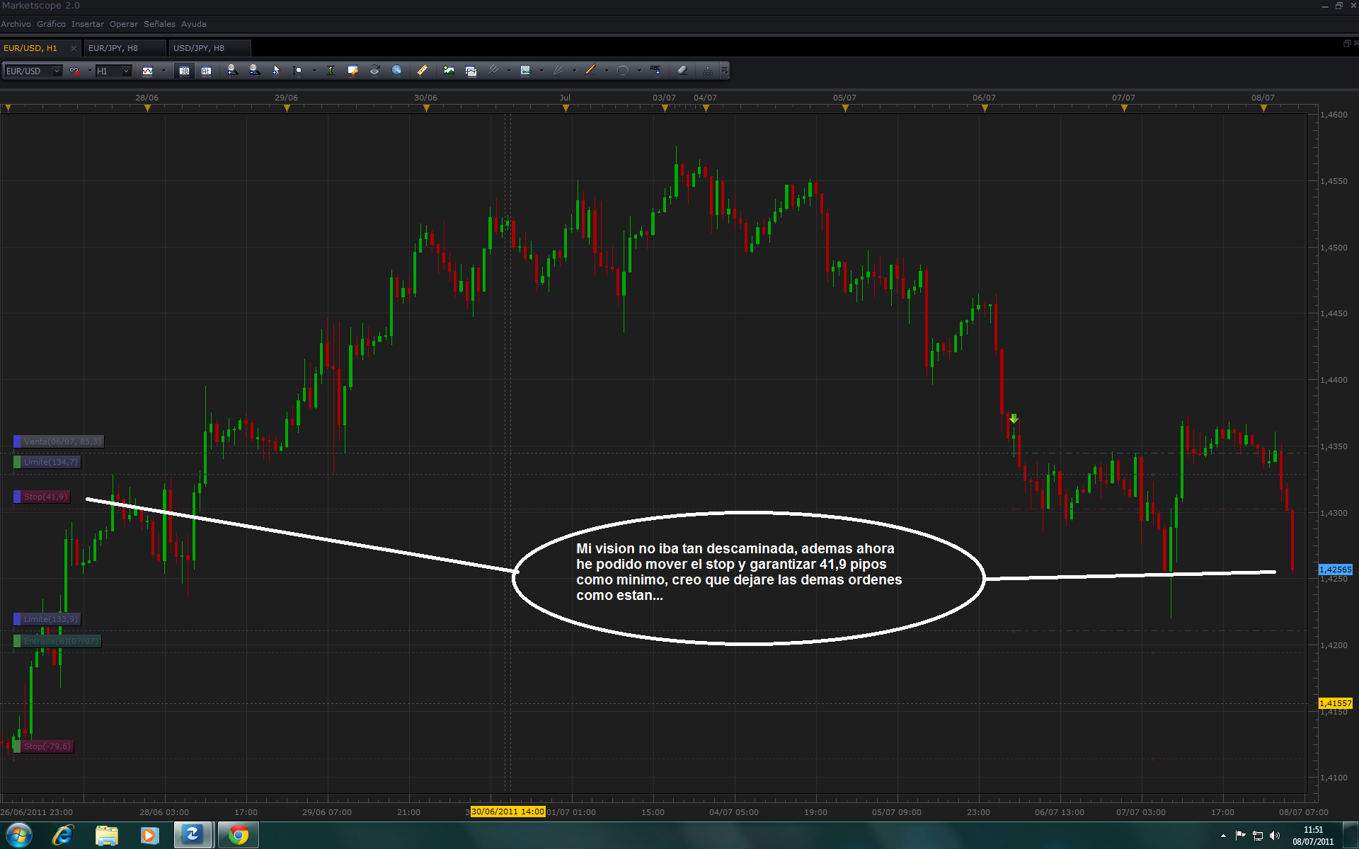 Bueno, el mercado siempre da una oportunidad mas, asi que hoy, antes de salir a echar unos blanquitos, ya he movido el stop de la orden vendedora, asi, si me pasa como ayer, por lo menos tengo 41,9 pipos de ganancia ya en la butxaka... y... si llega a abrirme la orden de compra, entonces espero que no baje mucho mas que lo que le he puesto de stop...
