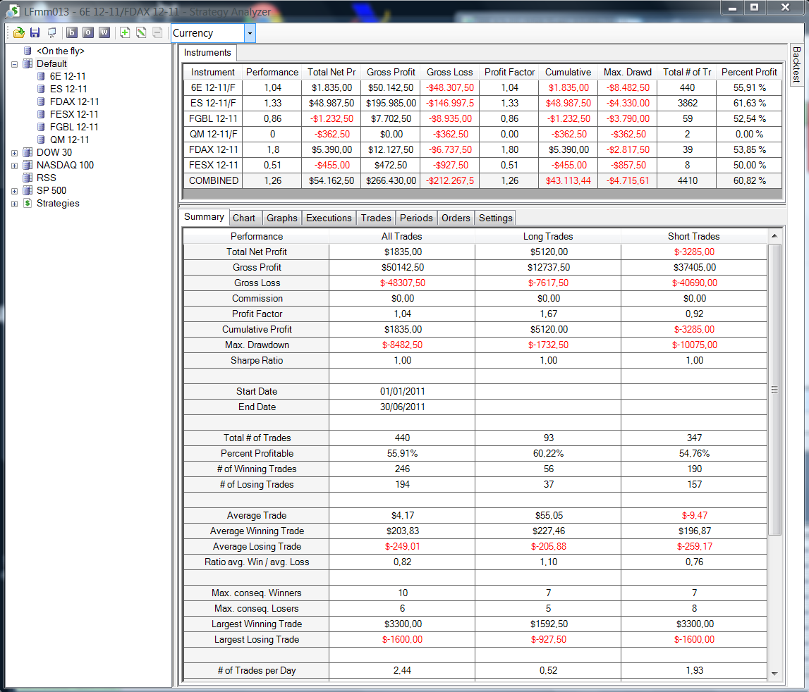 Si tienes ocasión ves a Strategy Analyzer y en lugar de seleccionar un solo instrumento selecciona un conjunto de ellos. Luego arrancas el backtest y lo que obtienes es un backtest secuencial de todos los instrumentos de ese conjunto.andriuking escribió:Pues en ello me encuentro, de hecho creo que participamos juntos en el foro de formación de traderninjaINtrader escribió:Parece que no has probado NinjaTrader 7andriuking escribió: El problema está en que la mayoría de las plataformas no permiten testear un sistema en varios activos a la vez o sobre una cartera de activos, de forma que es un trabajo muchas veces de chinos intentar estimar el comportamiento de la estrategia sobre la cartera..