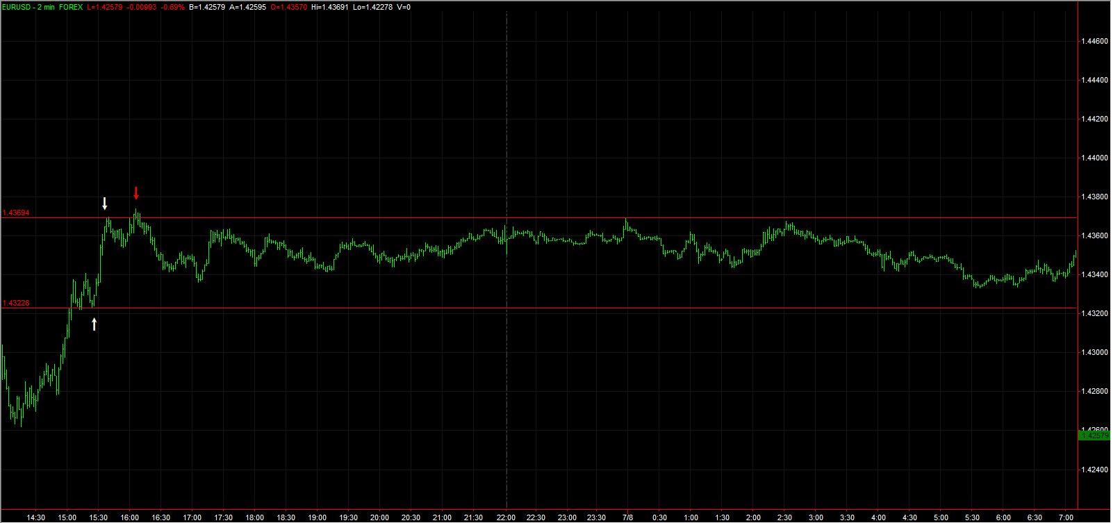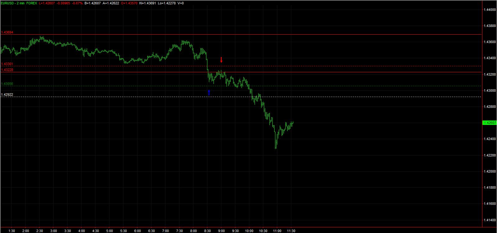 A las 10:05 compro 2 lots al precio 1.4292, marcado con la línea blanca, (2x 13=26 pipsa), quedando me con 1 lot. Tengo trade sin riesgo.