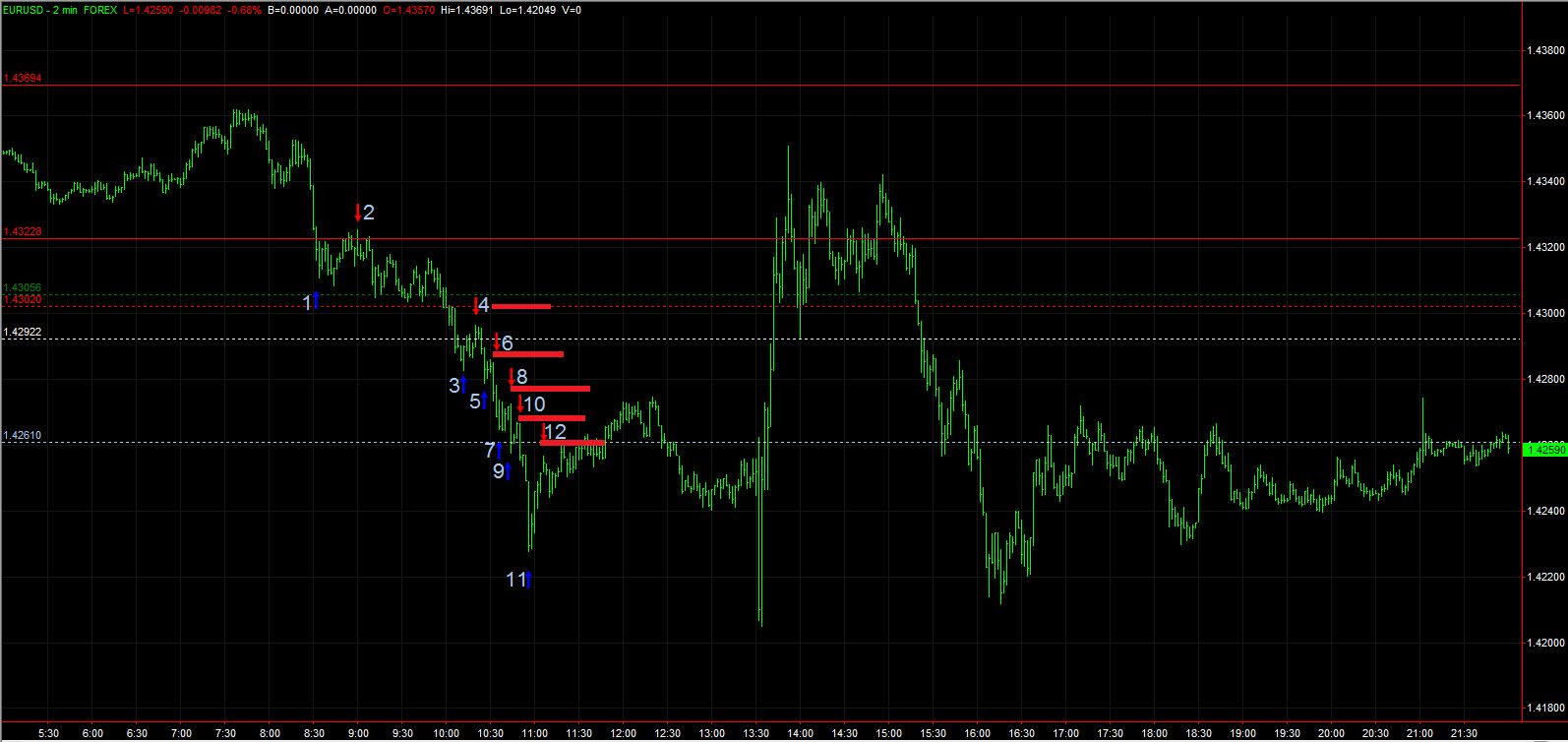 A las 11:20, mi posición queda cerrada al precio 1.4261. (1.4305-1.4261)x 1 lot=44 pips
