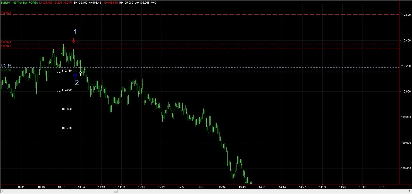 Nuestro orden de venta queda ejecutado al nivel de la línea verde, corto 110.15. Hay traders cual prefieren setups intradiarios, otros semanales, yo hago los dos.