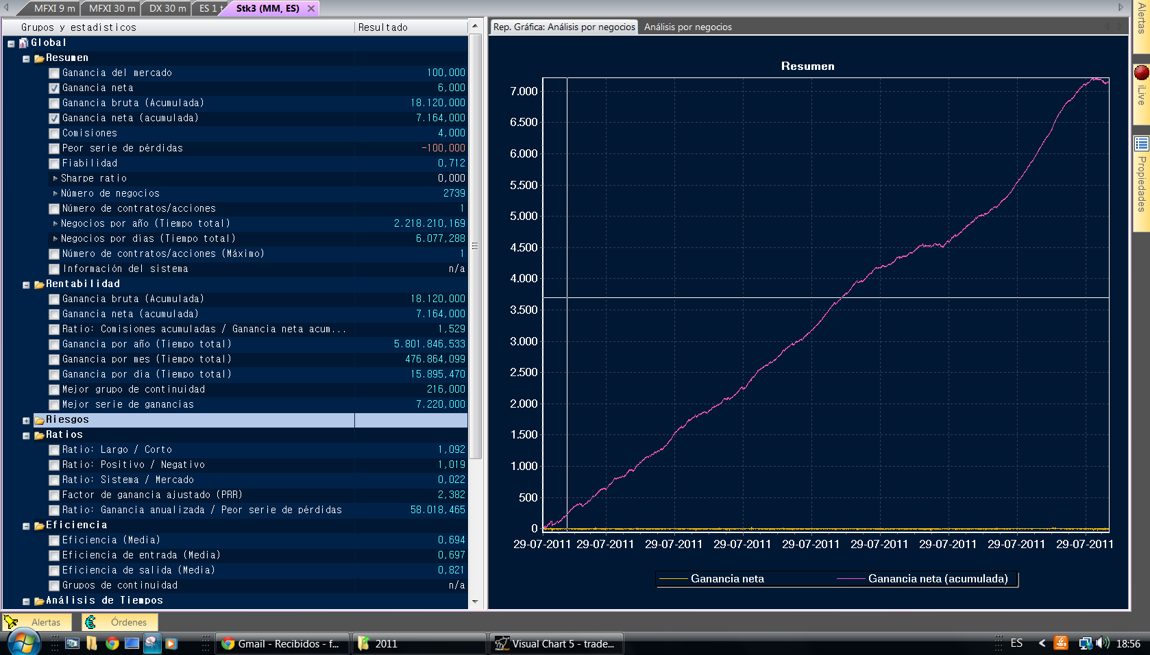 Hace tiempo realice un modelo teórico que funcionaba sobre el futuro del eurostoxx y que como puedes observar en la muestra que adjunto realizaba 2739 negocios (desde las 8:00 hasta las 18:50 ¡de un solo día!).