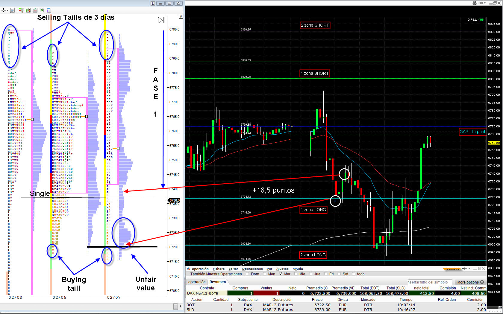 Después de la apertura el precio realiza una subida hasta los máximos del día anterior, donde los OTF crean un tallo vendedor. El precio entra a partir de ahí en Fase 1, según la teoría de la subasta, de unos 80 puntos de extensión, deteniéndose en los mínimos del día anterior donde crean un tallo comprador. En esa zona, que coincide con la Zona 1 de largos por los criterios de rango/volatilidad, comienza a crear valor. Ahí entré con un contrato largo, en la zona baja de la distribución de volumen. Al ser la tendencia intradiaria bajista hasta ese momento, mi objetivo estaba en la zona de 35/42, donde había un single y en la zona baja de esa otra distribución de volumen anterior que podía empujar el precio hasta nuevos mínimos... (como así fue). Viendo el Delta puse mi salida en 6.739... donde me sacó el mercado con +16,5 puntos.