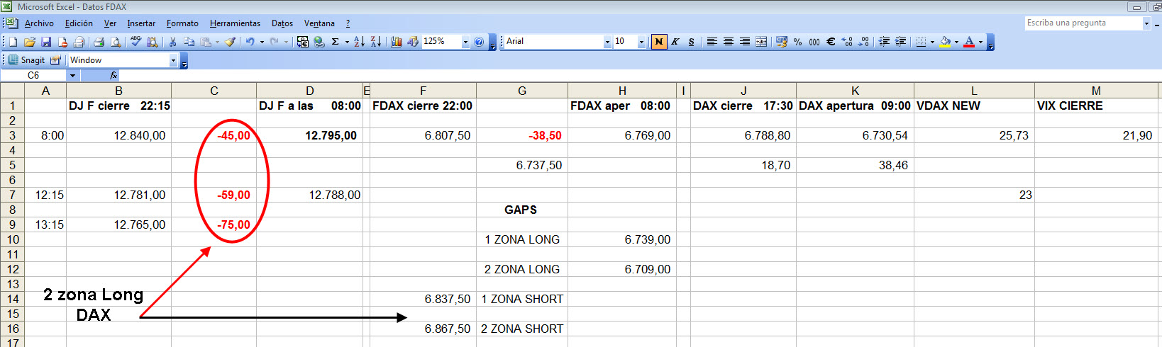 Hoy a primera hora de la mañana no he podido operar. Me incorporé a la sesión sobre las 12:00, un poco tarde para intentar tomar algún trade en la zona 1. De todas formas, quería poner a vuestra consideración mis análisis, siguiendo los criterios de la estrategia. La cotizazón del FDJI a las 08:00 tenía un gap de -45 puntos con respecto al cierre del día anterior. Muy cerca de los +/- 50 puntos que pueden marcar un día de tendencia. Cuando me incorporo a la sesión a las 12:15 la diferencia era ya de -59 puntos... y cuando el precio alcanza una hora más tarde la 2 zona logn el FDJI marcaba -75 puntos... Todo ello hizo que no entrara largo en la zona y quedarme fuera del mercado.
