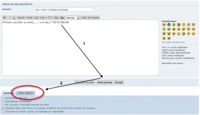 Primero escribes un texto..... y le das a "VISTA PREVIA" ... te aparecerán en la parte inferior dos pestañas, OPCIONES y SUBIR ADJUNTO...