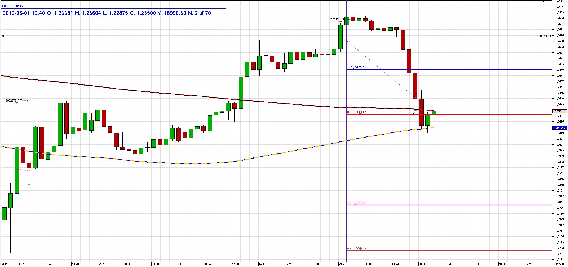 Mi idea fue esperar al par a que quebrara al alza el máximo del martes 29 de mayo 1.25099 y así poder entrar corto con poco o casi riesgo en la operación, por lo que establecí ese comercio en el 1.25138 y la salida en el 1.24502. Lo que animó a darle más confianza a este comercio que no se siempre se presenta en esta situación fue que, el precio no corrigió el lunes y los datos macros de hoy martes de la eurozona seguramente seguirían en la línea de la tendencia negativa como al final se confirmó, con el fundamental de hoy el de las ventas minoristas, se imponía antes de su liberación una corrección del precio como aconteció.
