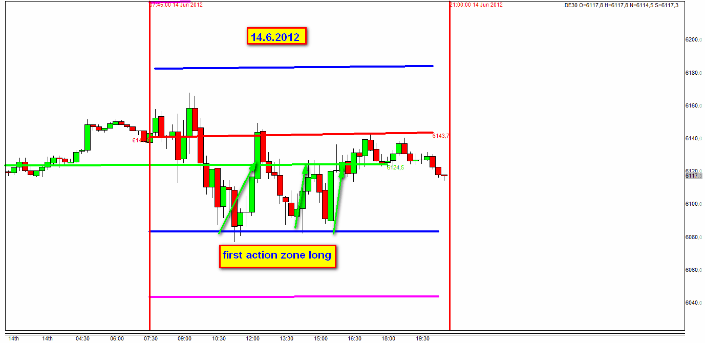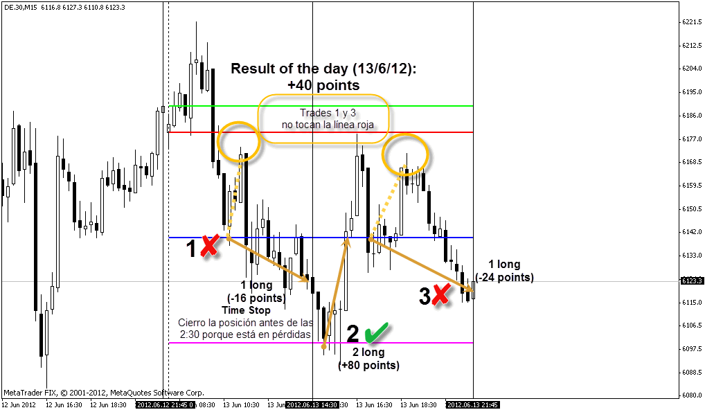 1.Después de las 14:30 h las tomas de posiciones en las zonas de actuación se abren cuando el precio cruza de abajo hacia arriba (para largos) o de arriba hacia abajo (para cortos) en dichas zonas. Cruzar incluye una vela que ha sido negociado fuera de las zonas y luego retrocede y cierra dentro de las zonas. La negociacion del precio fuera de las zonas y cierre dentro las zonas debe ser visible y significante.