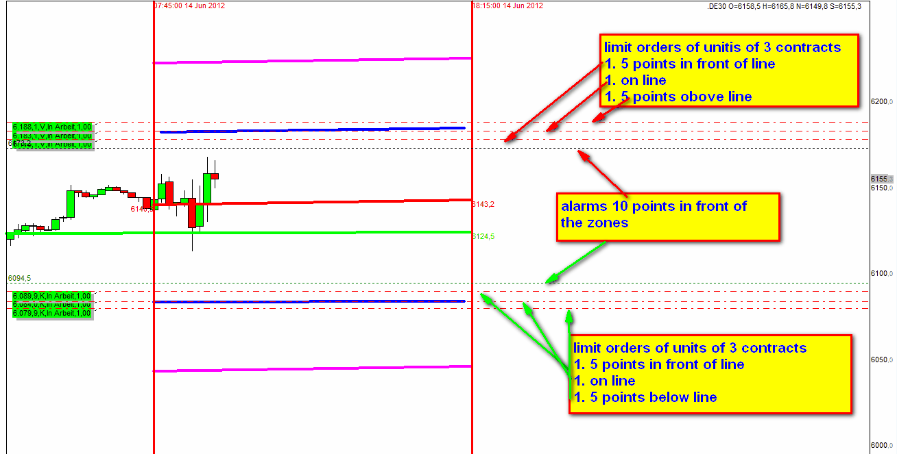 Recomiendo de operar con unidades de 3 Contratos tal como explica el grafico adjunto. La razon es que muchas veces el precio frena unos puntos delante de la zona. Los limit orders se pude alternar en el mismo grafico si lo