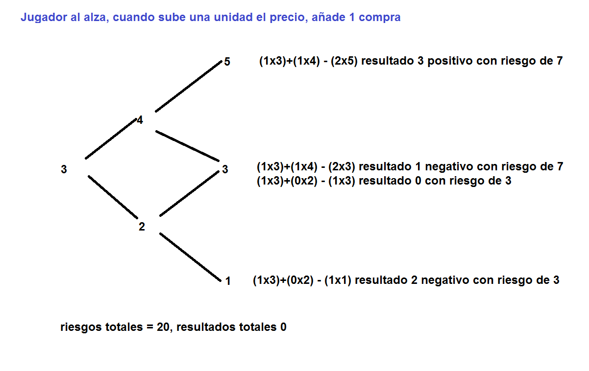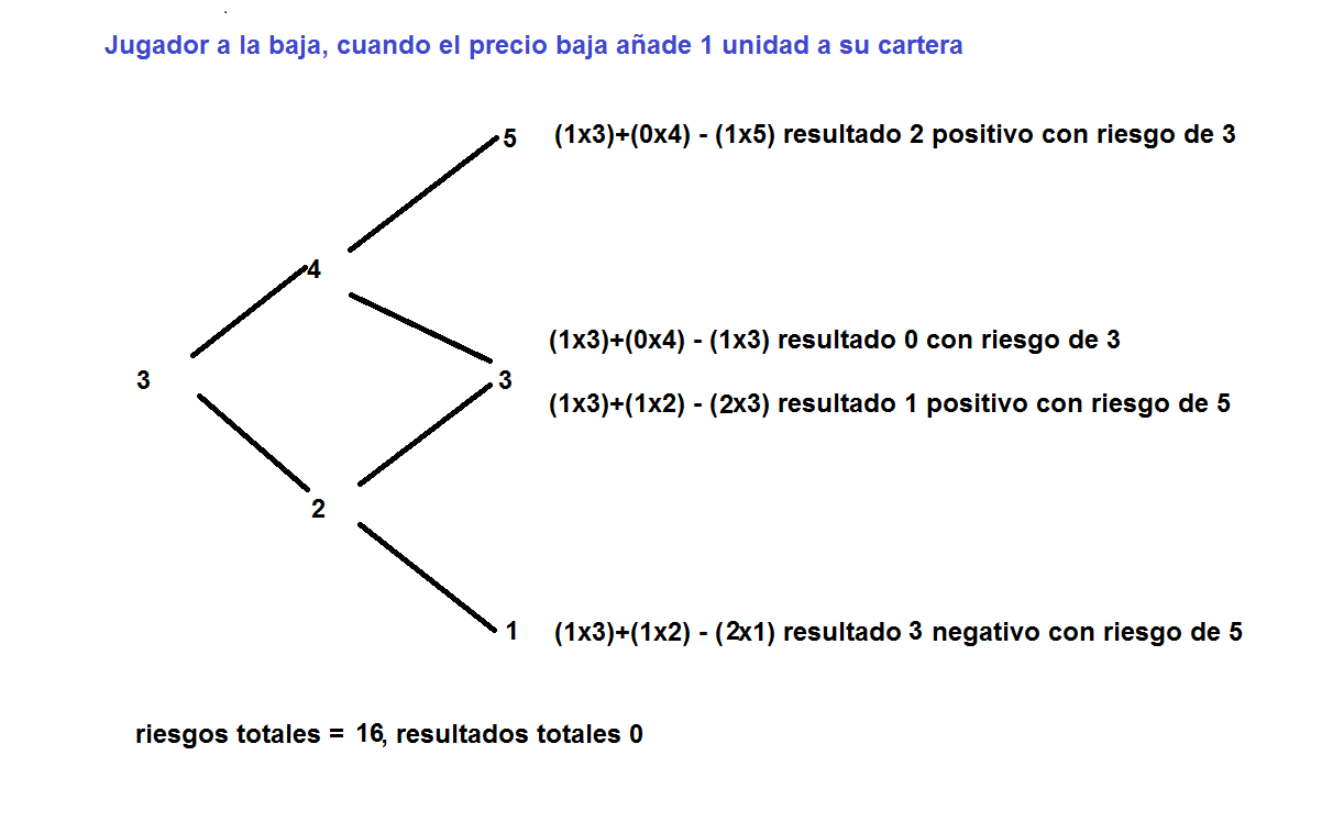 Lo primero que vemos, es que el riesgo que corre el bajista es menor que el alcista, 16 contra 20, el resultado por supuesto de todas las posibles jugadas es 0 (es normal) en los dos casos... pero! fijemonos que el bajista gana en 2 de los posibles estados de los 4 posibles (un 50% de todos ellos), mientras que el alcista solo lo hace en 1 de los 4 posibles (un 25% nada mas)...