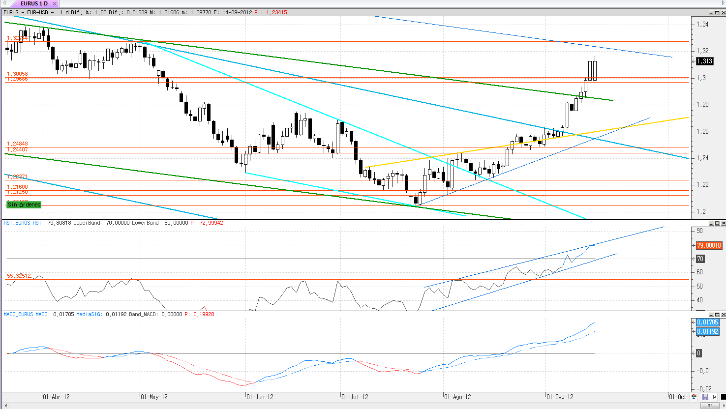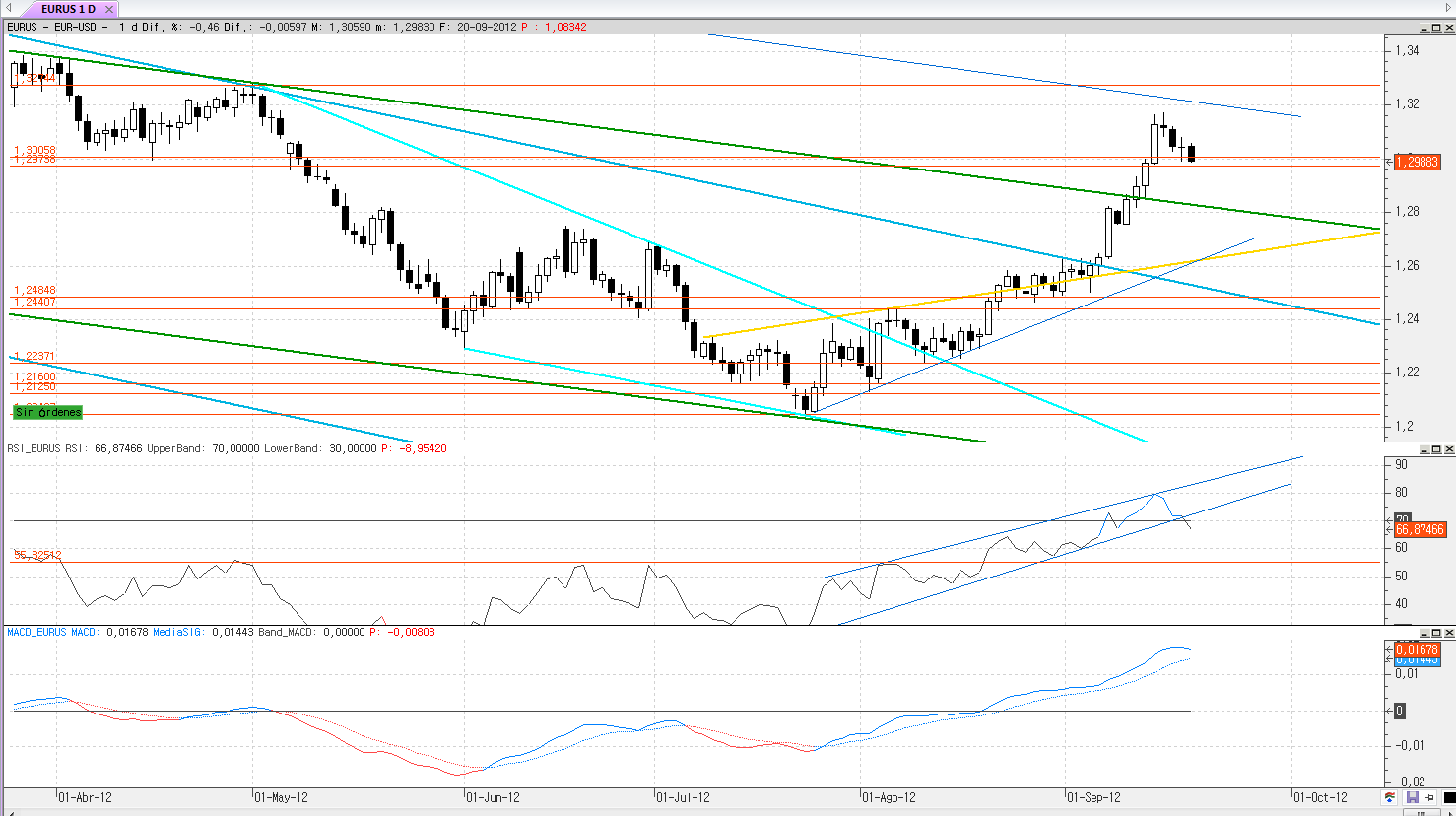 Después de la rotura de la cuña, estuvo unos días confirmando, y desarrollando posteriormente el hombro derecho, finalmente rompiendo al alza y confirmándolo el viernes tras unos días de consolidación. El objetivo de la figura h-c-h está en 1.2877 y la de la cuña en 1.3042. El viernes se paró en 1.2819, tras romper la que tenía anteriormente en 1.2753. ¿Y ahora qué? Pienso que podría subir un poco más, hasta la zona 1.2850-1.2870, donde daría por concluída la figura h-c-h, en este punto coincide el objetivo de la figura y el techo del canal bajista con una pendiente menos inclinada. Si no supera estos niveles el retroceso sería a zonas de soporte. En mi opinión sería abrir cortos en la zona 1.2850-1.2875 con stop en 1.2890. La superación del techo canal le llevaría al objetivo de la cuña 1.3004.
