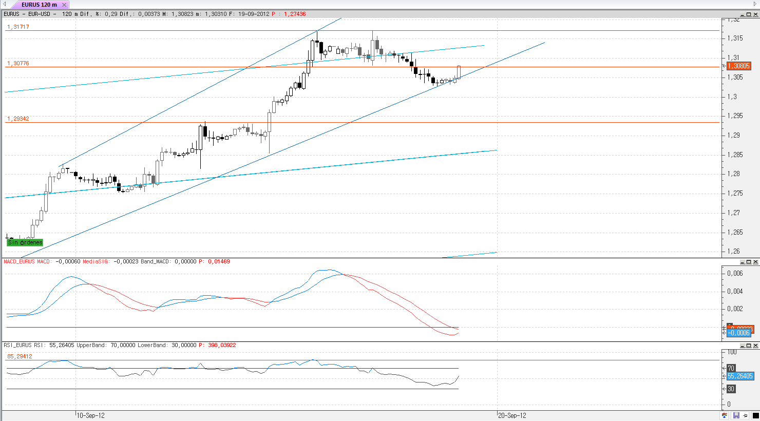 Buenos días, nos saco el stop, no llegó a objetivo, se ve cierta debilidad con divergencias claras. He tomado posiciones cortas en 13090 esperando que pierda el soporte de 1.3077 con objetivo 1.3015 en primer lugar y en segundo 1.2934, el stop esta vez esta un poco alejado en 1.3180.