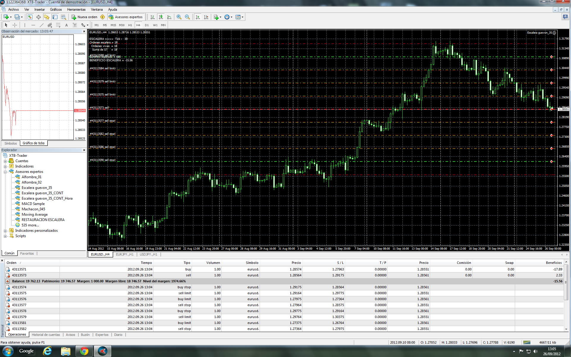 En la escalera, Güevón pone todo tipo de órdenes, o sea, donde pone un Buy-Stop, pone un Sell-Limit. Esto significa que si, por ejemplo, se activa una orden Buy-Stop y el precio sigue hacia arriba hasta hacernos ganar esos 60 pips, la Sell-Limit nos hace perder el equivalente. No hemos ganado nada. Hemos perdido spreads. Y como nuestro jefe vea lo que estamos haciendo, no va a estar precisamente contento...