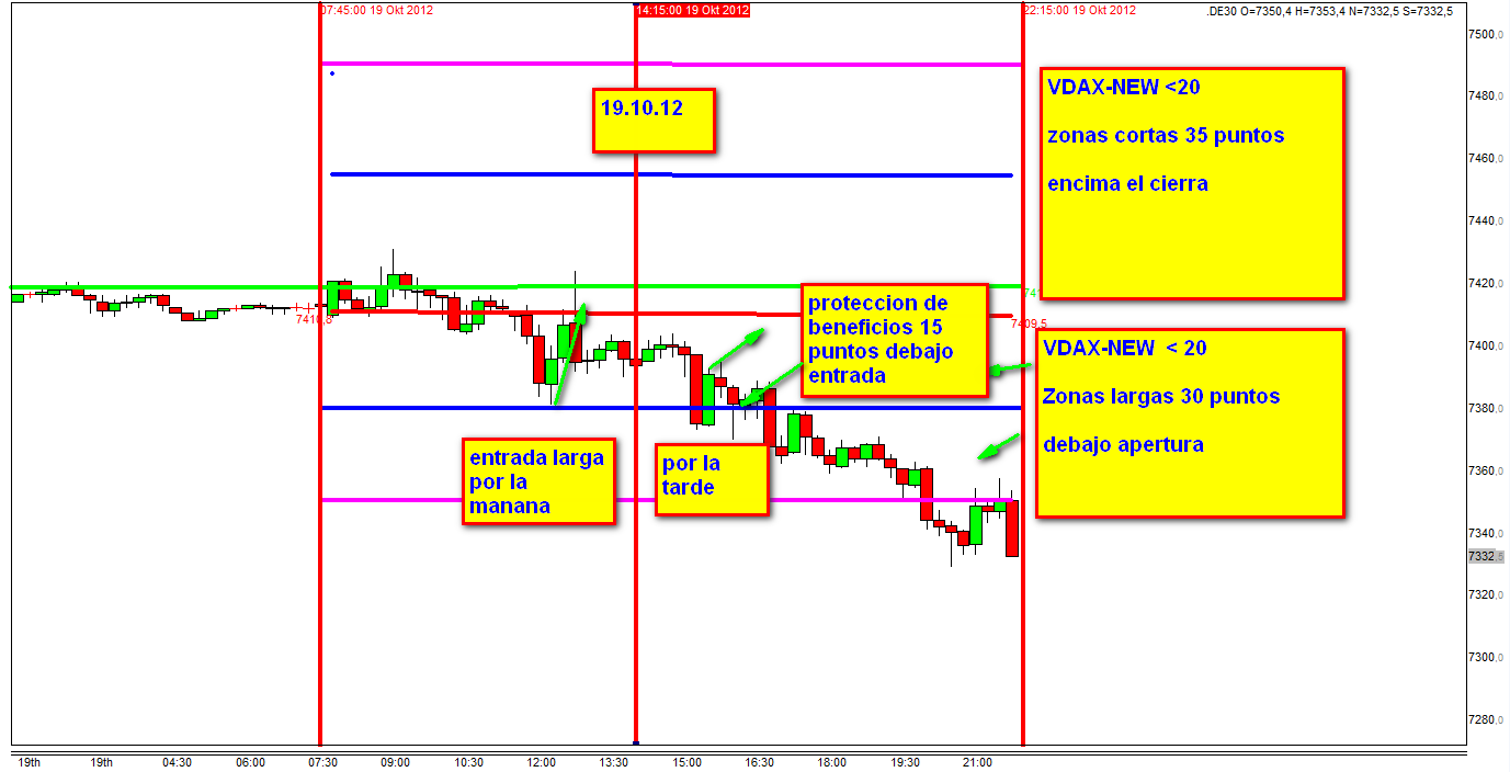 En cuanto el VDA-NEW cotiza por debajo de 20, se puede considerar abrir una posición larga en el área de cierre/apertura siempre que los DJIA FUT tengan tendencia en alza durante la noche y al abrir el FDAX a las 8h. La Z1 larga será entonces la segunda zona, Z2L.