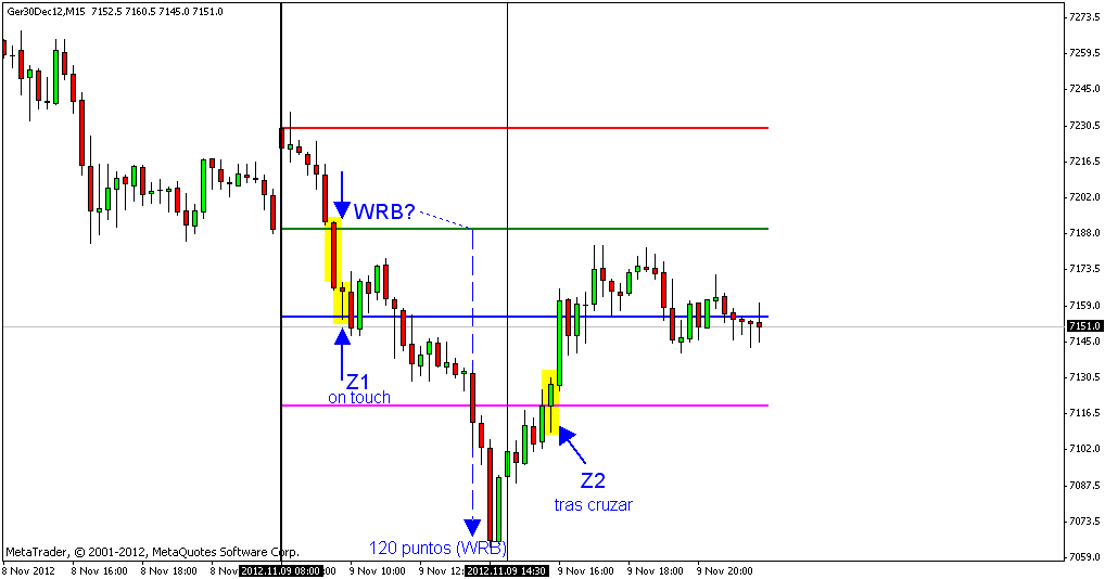 Entrada z1 larga on touch a las 10h, stop de perdidas en z1 cuando precio a +15 y cierre en breakeven.