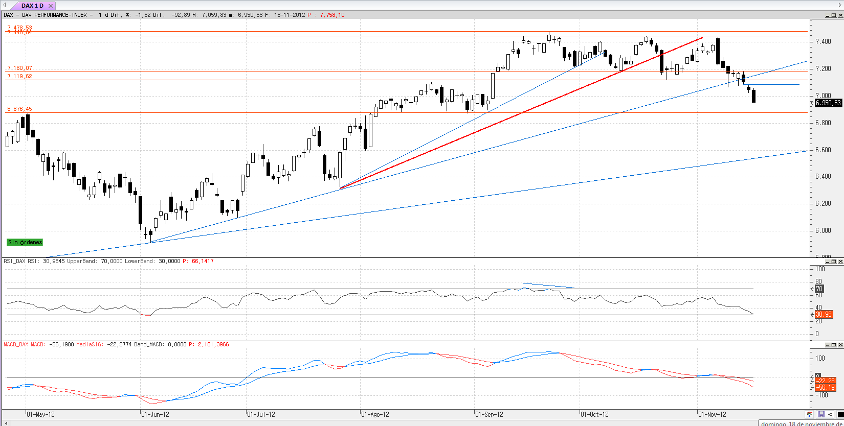 Buenos días, el escenario no ha cambiado, sigue igual, con tendencia bajista a corto plazo, ahora bien, si nos fijamos en el gráfico del sp500 vemos como rebota desde la zona cercana a la sobrecompra que coincide con la base del canal bajista y un soporte leve, pero pienso que es simplemente un rebote que le puede llevar a la zona 1375-1395. ¿Y este escenario como cuadra con el ibex y el dax? En cuanto al ibex podría rebotar hacia el techo del canal pero su estructura es más débil que la del sp500 y en cuanto al dax podría intentar cerrar el hueco dejado el día 15. Tras este rebote seguirán las caídas.