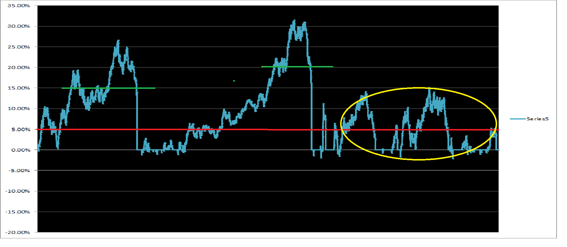 En el ejemplo, es un sistema que utilizo para ver los desvíos de los activos, dependiendo el filtro de utilización que pongamos, podremos analizar la idonedad del juego a utilizar. Establecemos la zona de movilidad del posicionamiento en un 10% de entrada como restricción y un 20% de salida(la medida % no es neta, sino es referenciada a una acotación, con lo que hay diferencias sustanciales) En el caso del euro como es una activo con menor volatilidad le estableceremos un filtro de posicionamiento del 5% y 10%.