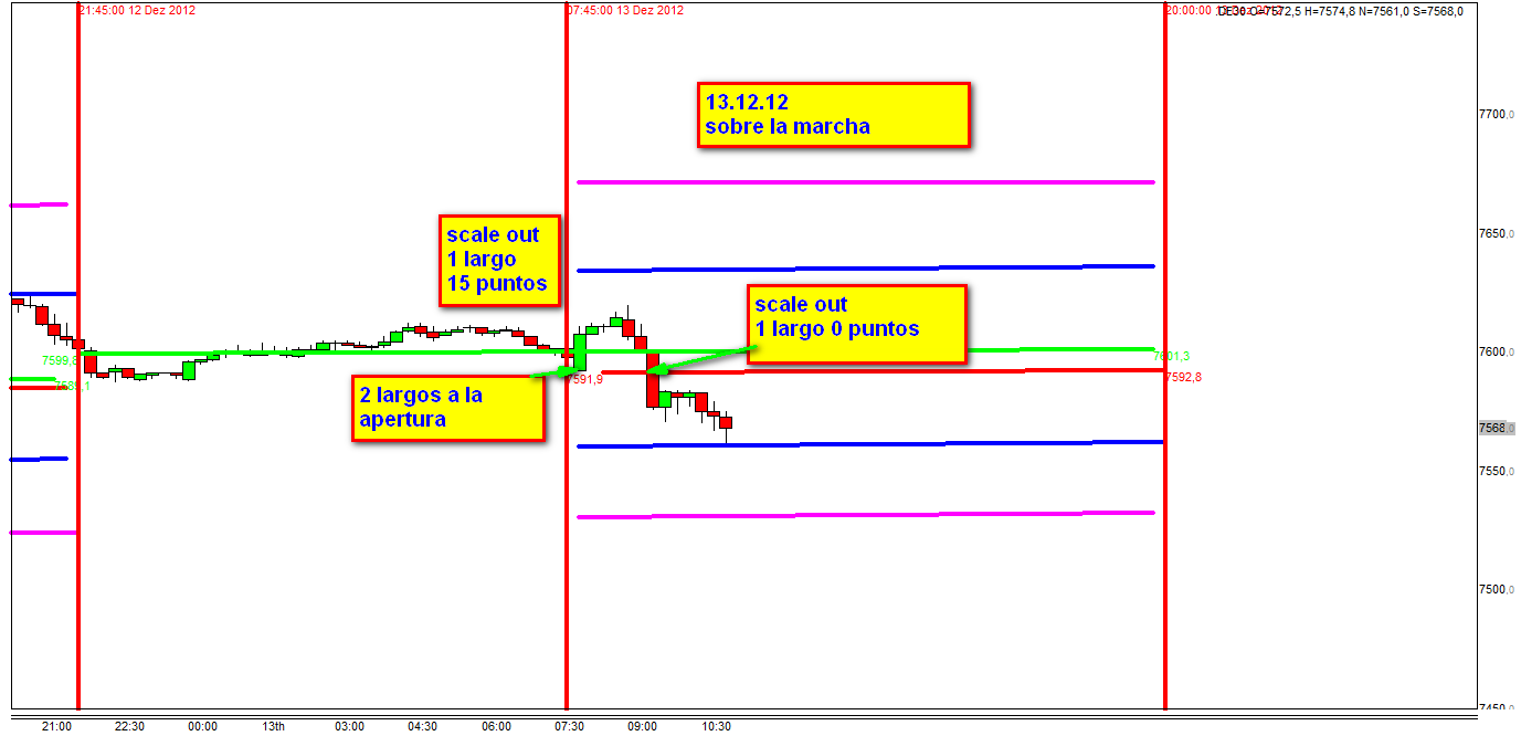 Me explico, ya que posiblemente yo estoy equivocado, pero así lo veo: fue una noche tranquila, a las 8h todos los futuros mas o menos planos, no había huecos a destacar, hasta las 9:15 el FDAX apenas había oscilado 15 puntos en el área de cierre /apertura, inclusive la recomendación de Georg a las 8:36 era de operar en zonas. Pero por algún motivo (¿¿ quizás Intuición??),abriste a las 7:00 una posición de compra de 3 contratos, una especie de entrada larga especial utilizando scale.