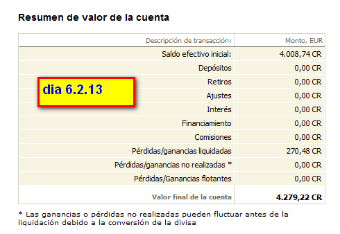 La cuenta empezo el dia 6 con 4000 EUR y hasta ayer ha acumulado 1200 EUR es decir un 30%. Durante estos 8 dias no hubo