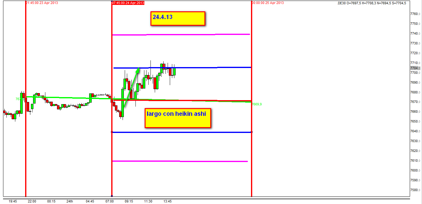 La zona enlargada se extiente aproximadamente hacia la mitad de la zona larga para largos y hacia la mitad de la zona corta para cortos. Las entradas aplicamos con la ayuda del Heikin Ashi de 5 minutos a partir de las 9h tal como explicado con varios graficos los ultimos dias. Al abrir posiciones el precio lo consideramos como entrada en la primera zona y si el precio va en contra la segunda zona tendra la misma distancia como la zonas normales en su dia.
