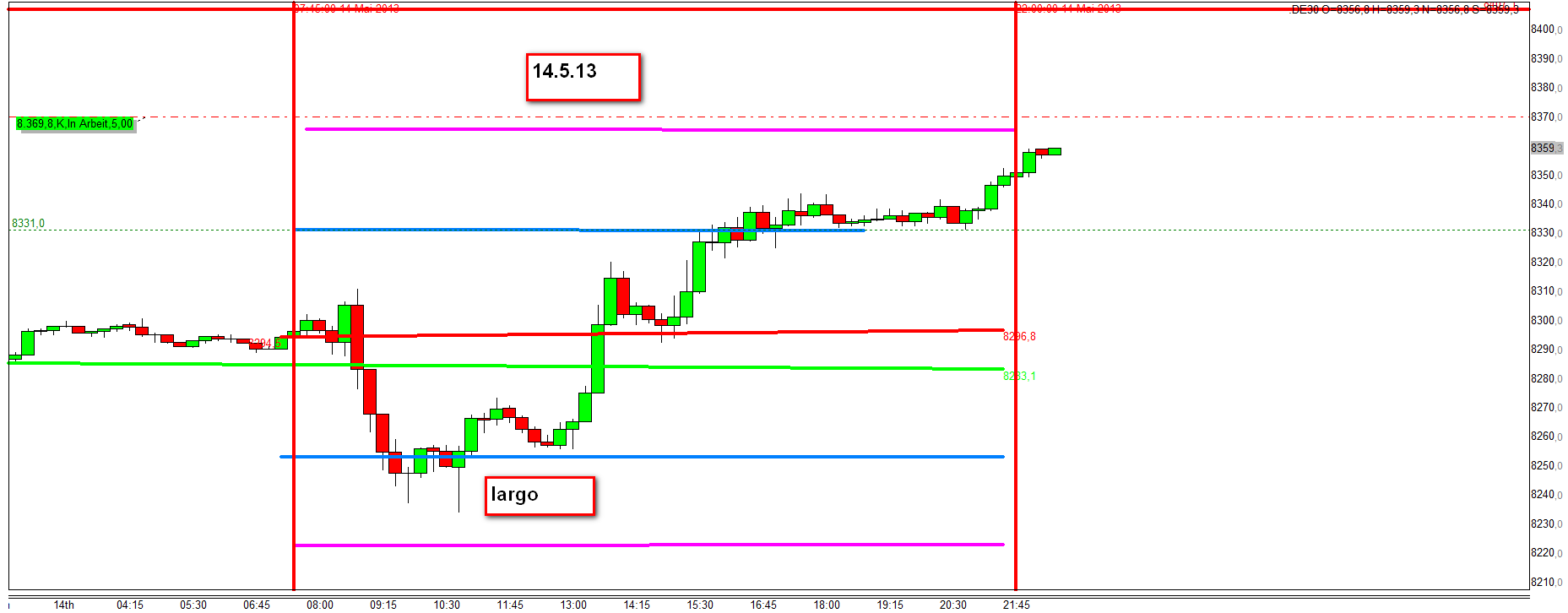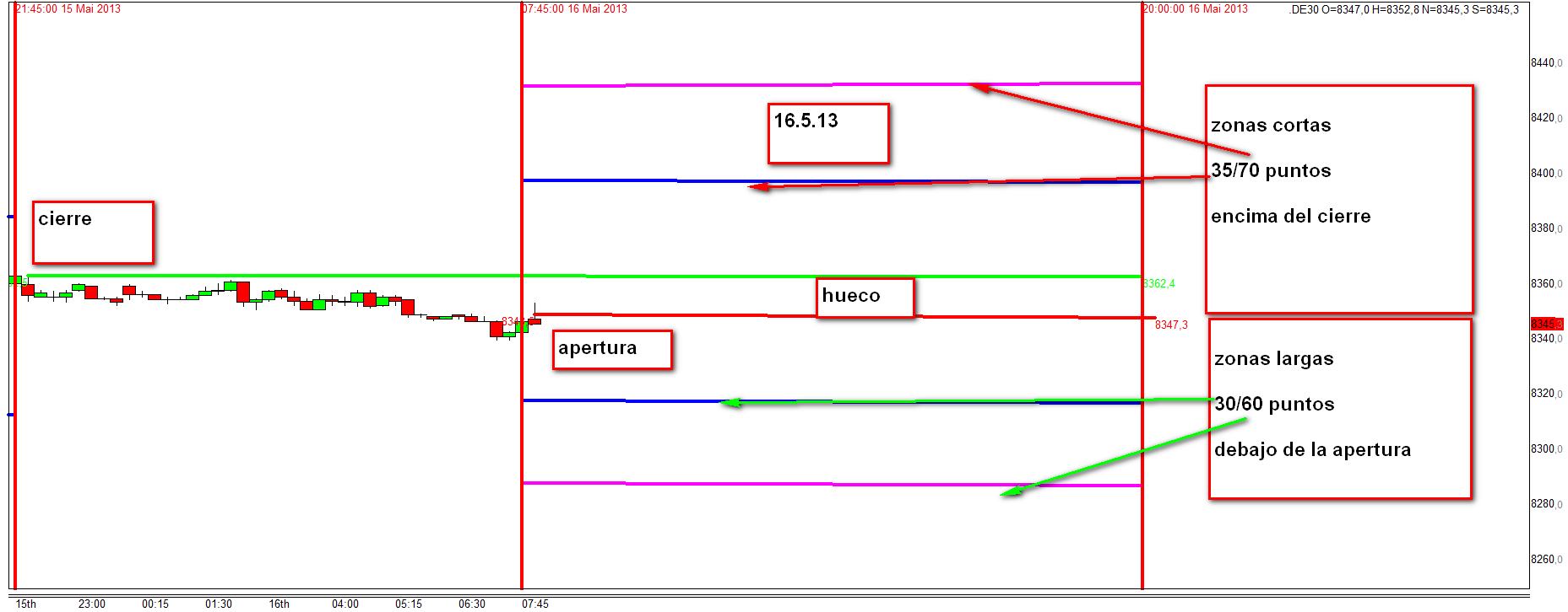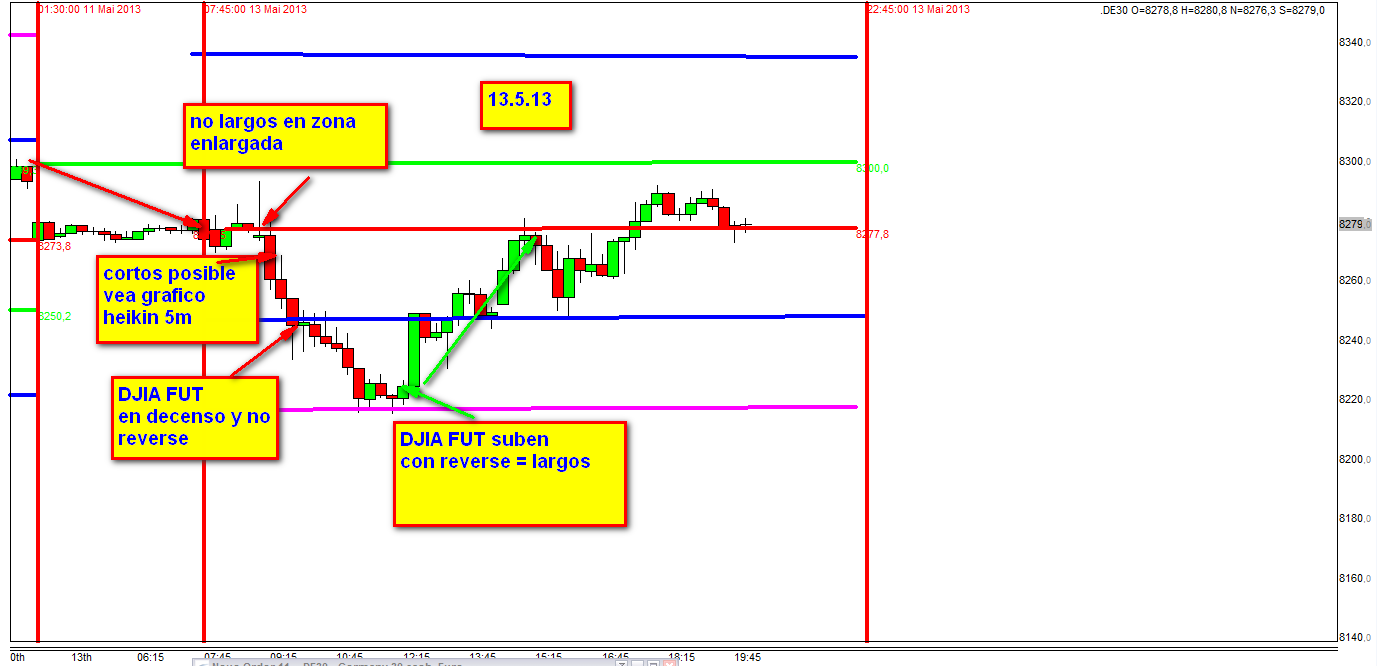 El dia 13.5.13 es decir ayer el precio bajo hasta la segunda zona larga y entramos largo segun las reglas: