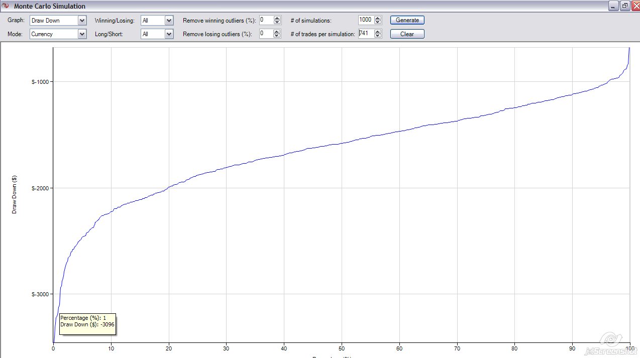 , no soy un experto en sistemas, es mas es el primero que hago, mas o menos lo que he querido decir, es que cuando se tiene el sistema terminado y testeado el siguiente paso fue hacerle una prueba de Montecarlo que básicamentenlo lo que hace es realizar una simulación del modelo generando muestras aleatorias para las variables que entran en juego obteniendo en este caso el valor del Máximo DD y eso se ha repetido 1000 veces, en esta fase lo que se obtuvo fue esta curva del DD max esperado: