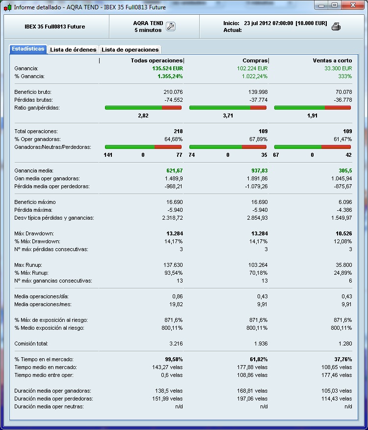 He escrito un algoritmo basado en Demark y filtrado un poco mediante líneas de máximos y mínimos de 12 y 6 barras (ultima hora y ultima media hora) sobre los futuros del IBEX a 5 minutos. El caso es que me da en backtest unos resultados brutales de 271% en 3 meses. En teoría no se puede optimizar porque no tiene parámetros, pero en la práctica se ha ido optimizando con el tiempo según he ido corrigiendo cosas cuando el sistema cometía errores flagrantes. Un problema del sistema secuencial de Demark es que si hay tendencia el sistema da continuamente ordenes de compra si es en caída, o de venta si es en subida, con lo que te hace ir contra mercado y hacer uso intensivo de stops valiendote una pasta. Por eso lo filtré con las lineas de 1 hora y luego con las de media. El sistema no hace uso de stops (por ahora no he podido implementar stops útiles). Me da unos resultados de 69.64% en operaciones con ganancias y un Drawdown de 3818 euros frente a un beneficio (teórico) de 33875.