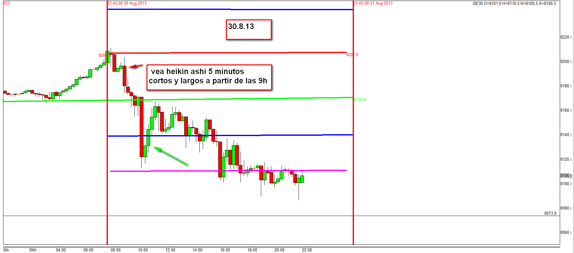 Trading con vela heikin ashi 5 minutos. En la zona enlargada cierre/apertura siempre con stop loss positivo de 20 puntos.