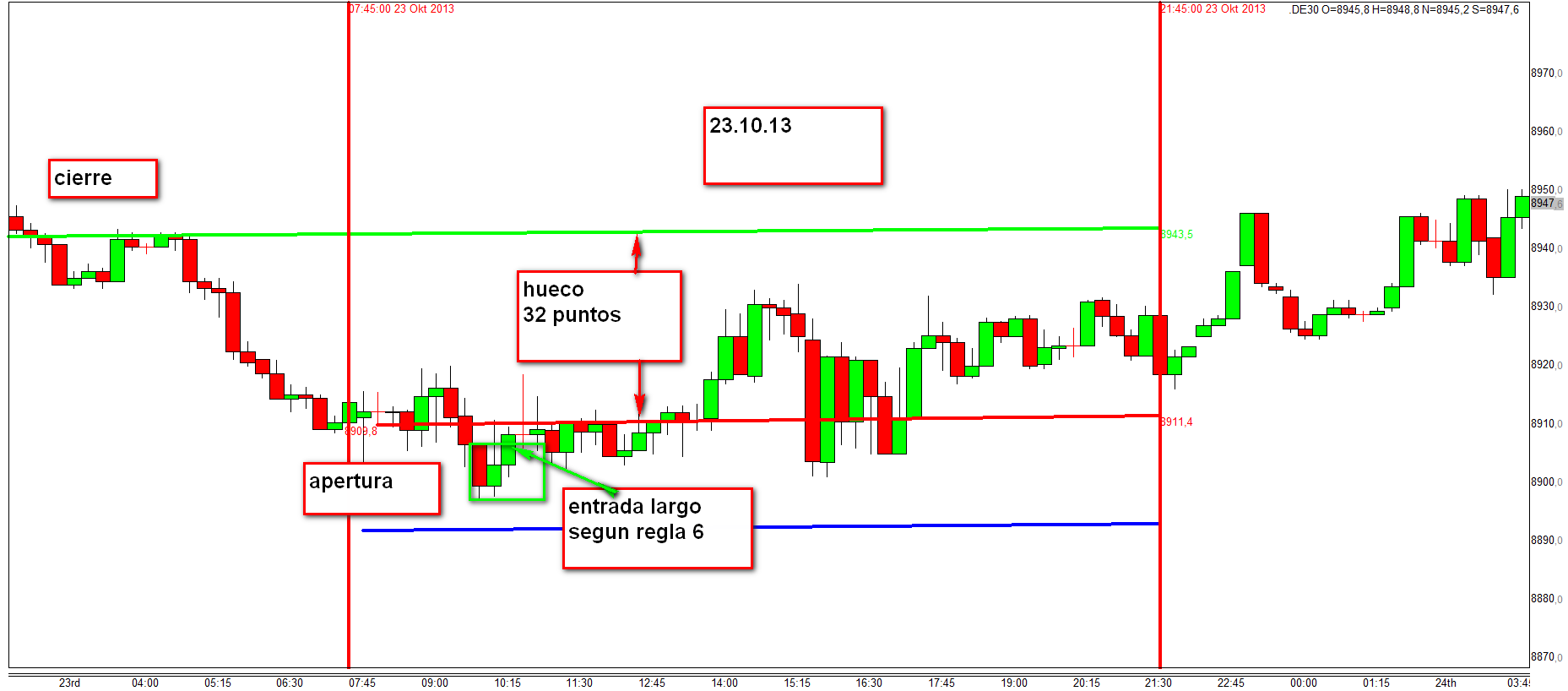 Si no entendí mal , el dia 23 entramos largos por el hueco de 30 puntos y por un reverse (aunque creo que antes de ese reverse había habido otro) en el Dax. Aunque yo ese reverse que tu señalas no lo tengo nada claro ya que la mecha de la vela queda en sentido contrario.