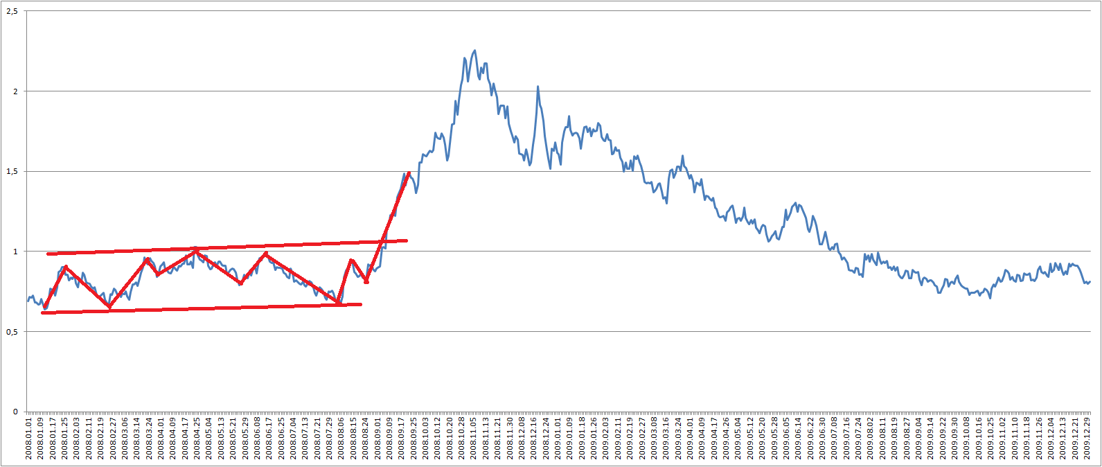 Si situáramos lo que tenemos ahora con 2008 , estaríamos hablando de que nos movemos en la línea que ves dentro del primer canal, y eso que no te hago ya ni referencia al momento de la explosión. Es decir, diseñes lo que diseñes, si es válido para 2008, no lo será tanto para 2012 por ejemplo, donde la utilidad de los sistemas tendenciales fue más que pésima.
