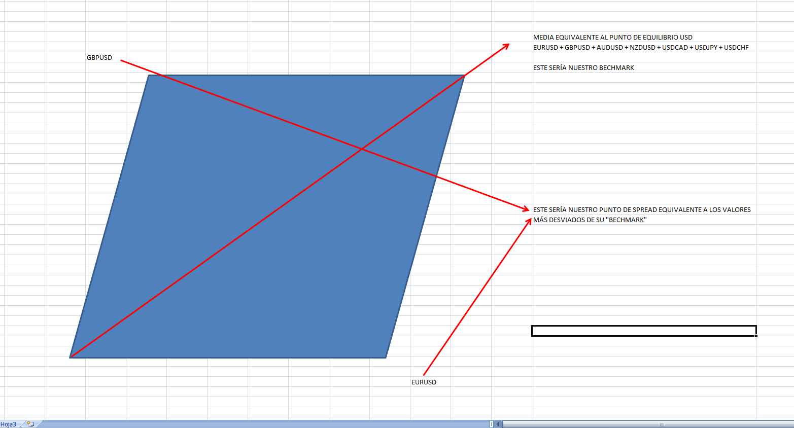 Lo que trataba de decir con el Benchmark, es más o menos sacar un valor o precio de referencia en PIPS. Sabiendo esto se puede determinar la desviación de cada uno de los cruces que lo componen. Lo ideal sería hacerlo como Reuters (160 cruces de divisas), pero sería complicadísimo encontrar cotización en TR. Si lo piensas mejor, las 8 monedas principales abarcan mucho % del total, luego el resto es opcionalmente desechable.