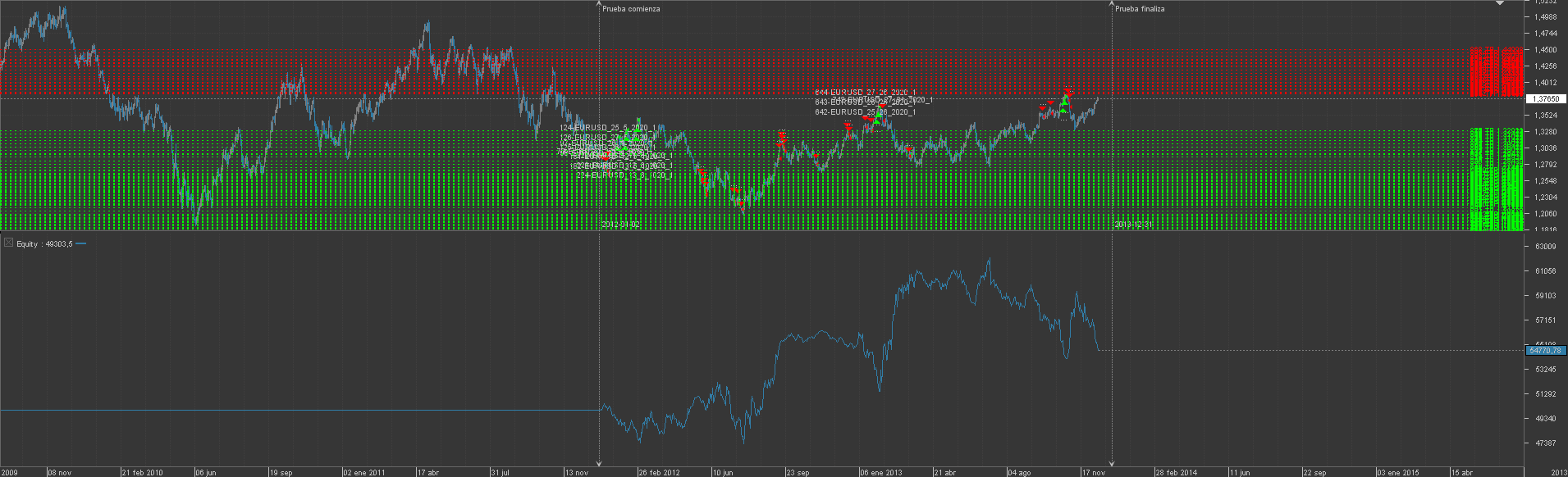 Comenzando el lunes a las 9 de la mañana hora española, independientemente de cuándo acabe, aunque haya que esperarse días. De momento, podrías hacerlo sin poner s/l en ningún lugar para ver históricamente (especialmente en 2008-2010) cómo habría ido el tema en cuanto a drawdown. Cerraríamos el grid cada vez que obtuviera un beneficio del 2%, y podríamos elevar el volumen en las órdenes en 0.01 lote cada vez que llegara a ganar entre un 10 a un 20% sobre la equity de partida.