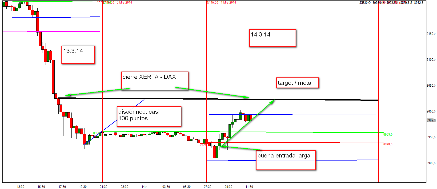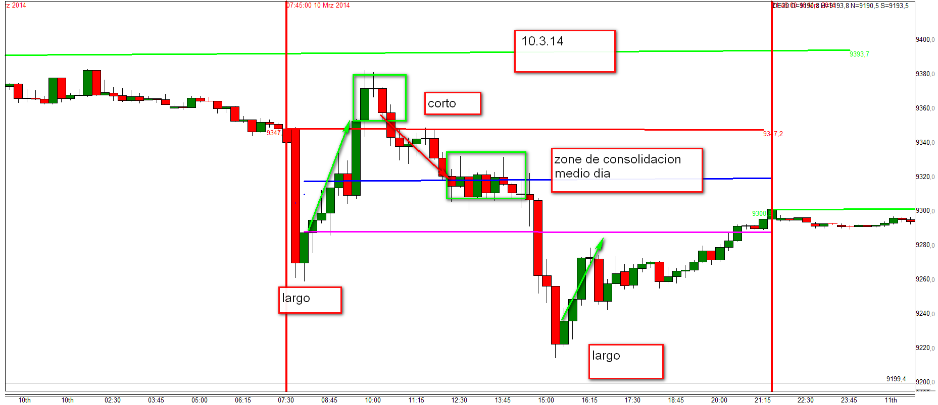 Con respecto al día 10/3/2014, estoy de acuerdo en todo lo que amablemente indicas en el gráfico, lo que no termino de ver es cómo determinaste que la zona del lateral que marcas era de consolidación bajista.