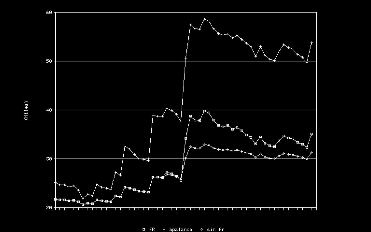 ¿Alguno sabe el porcentaje de riesgo que va cogiendo el Fixed Ratio según se incrementa el capital?...pues tiende asintóticamente a 0, es decir cuanto más capital gana menos arriesga tras superar un umbral. La "ilusión" de que el Fixed Ratio supera al Fixed Fraction, sólo se produce en los estadios iniciales antes de llegar a ese umbral, porque el Fixed Ratio en ese periodo incrementa la fracción de capital arriesgada y dicha fracción puede superar la fracción escogida del Fixed fraction...pero en cuanto se supera ese umbral, el riesgo en en Fixed Ratio desciende monótonamente.